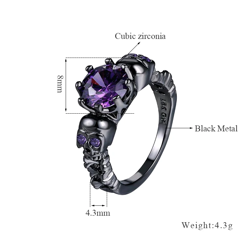 The Dark Magic Skull Ring. Our absolute BEST SELLER among our dragon rings! A mysterious and dark fashion accessory. Smooth black gold plating over skin safe materials and sparkling, inlaid AAA zircons give this black beauty an exquisite and bold attitude. An enchanting violet AAA zircon sits at the center, surrounded by two detailed black skulls with hypnotic eyes on either side. This Dark Magic Skull Ring makes a dark and beautiful gift!