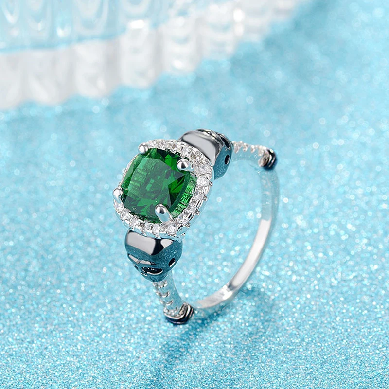 Be the envy of all with the Envy Emerald Skull Ring. A unique jewelry item that has a dazzling emerald zircon and black skull accents make this unique jewelry item a one of a kind ring. The delicate texture and smooth durability bring an attitude of fashion to the sophisticated wearer. Each piece has precision cut, sparkling emerald CZ square shaped stone held in place by the four corner facet. Black skulls contrast the polished band. Get your Envy Emerald Skull Ring! Made of skin safe materials.